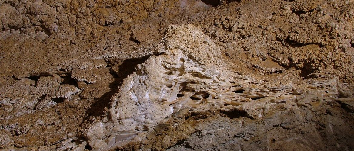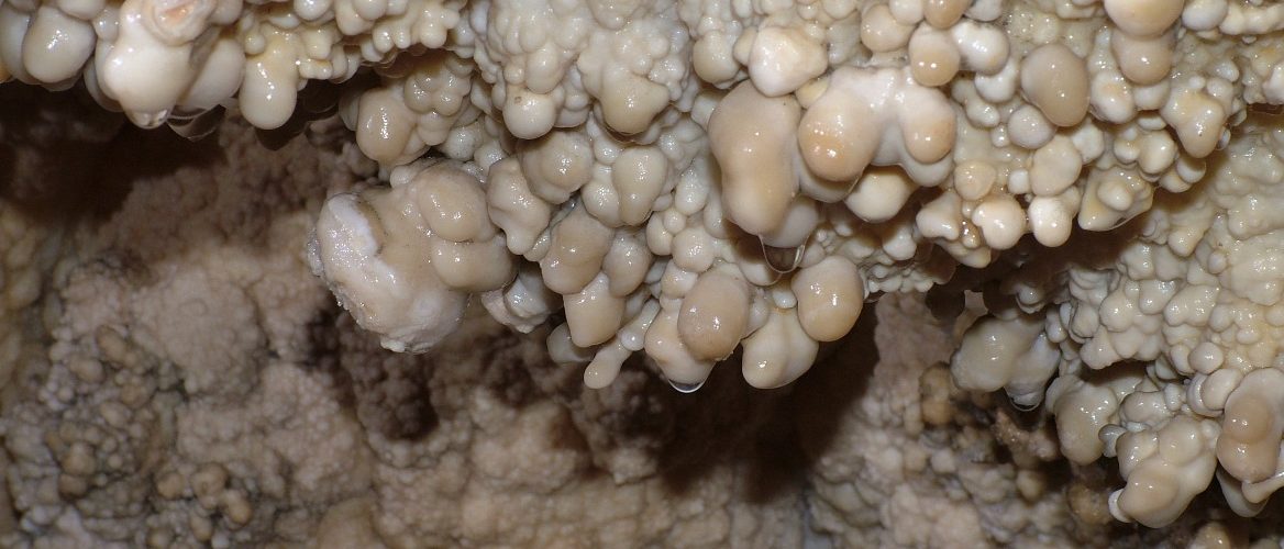 Die Route führt auf dem Gehweg nach rechts, aber wenn man nach links schaut, sieht man den einen in seiner natürlichsten Form belassenen Bereich der Höhle: den Blumengarten, der im Verlaufe von Jahrmillionen aus Erbsensteinen und Blumenkohl „bepflanzt" ...